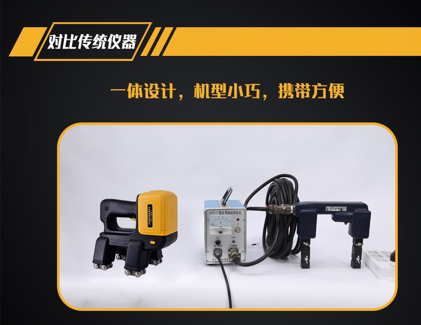 1、一体式旋转磁场探伤仪,专为便携式设计,无需外接220V电源,交叉磁轭与电源直接对接后即可产生旋转磁场,配有两组快捷拆换电源,一用一备续航时间更长;